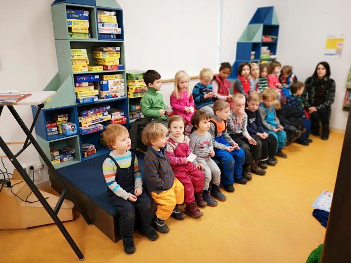 In regelmäßigen Abständen von 6-8 Wochen besuchen wir die Städtische Bibliothek in Pieschen, wo uns von einem Bibliothekar(in) eine spannende Geschichte, z.B. zum Thema Freundschaft, Trauer, Mut, Angst oder Entwicklung von Naturprozessen vorgetragen wird. Die Woche, in welcher der Bibliothekstag stattfindet, ist gleichzeitig Lieblingsbuchwoche. Das bedeutet, dass jedes Kind an einem der fünf Tage ein Lieblingsbuch & Hörspiel mitbringen kann, aus denen wir dann eine Geschichte vorlesen bzw. anhören.